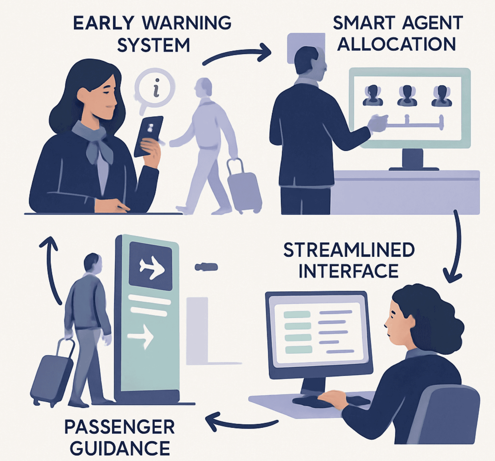 The system automatically assigns agents to optimal locations based on affected passenger count and agent expertise.