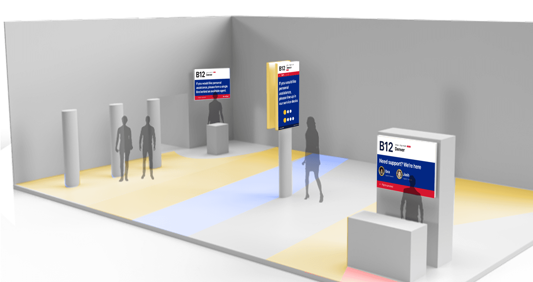 The existing surrounding screens change to help direct customers to the help desks, creating a coordinated wayfinding system throughout the gate area.