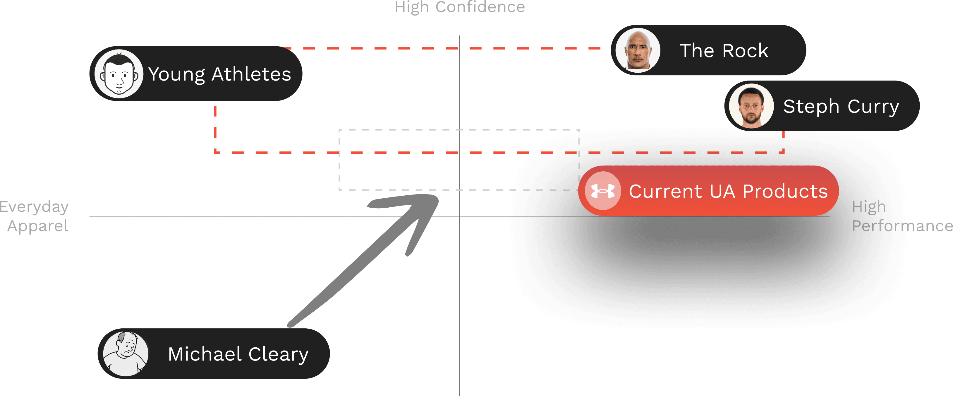 We used a 2x2 (Performance ↔ Everyday, Low ↔ High Confidence) to show UA already owns high-performance + high-confidence, but our target everyday older man sits lower-confidence. Our goal was to bring him into UA’s strength by lifting up our every day man to feel like an everyday confident athlete in our clothes